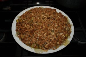 Pour over rhubarb then crumble remaining topping on top.